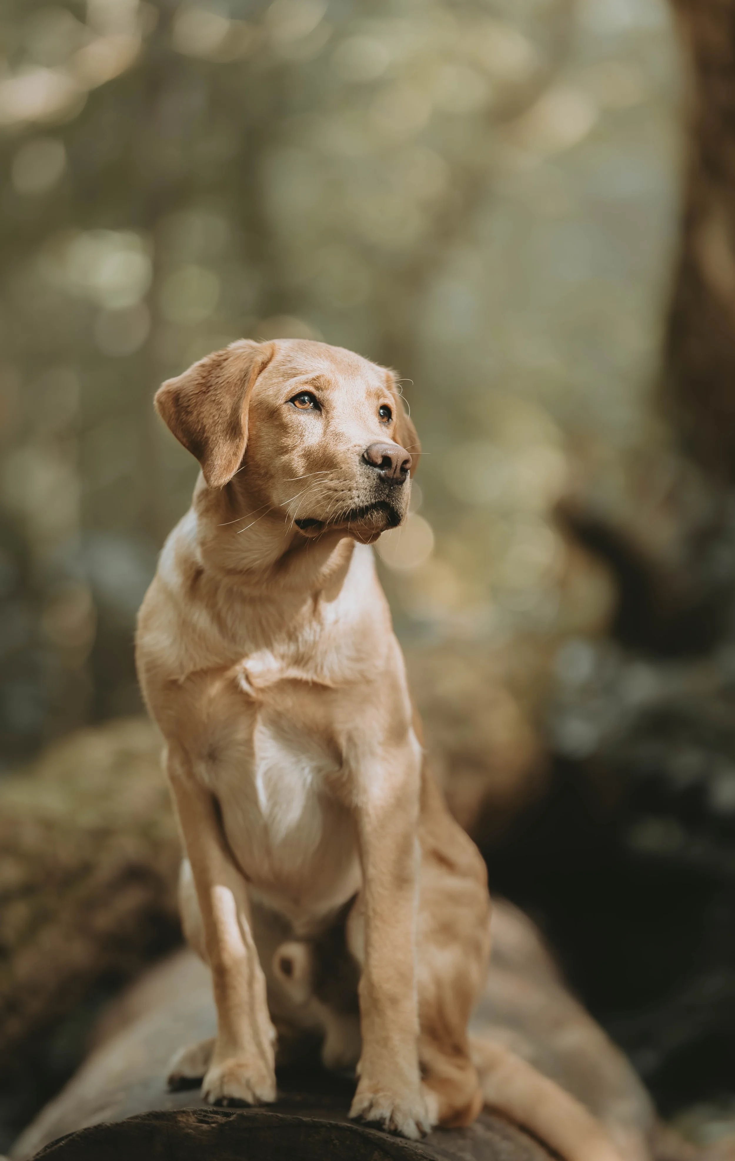 En gul labrador retriver valp sitter utomhus på en trädstam, omgiven av suddiga träd och naturligt landskap.