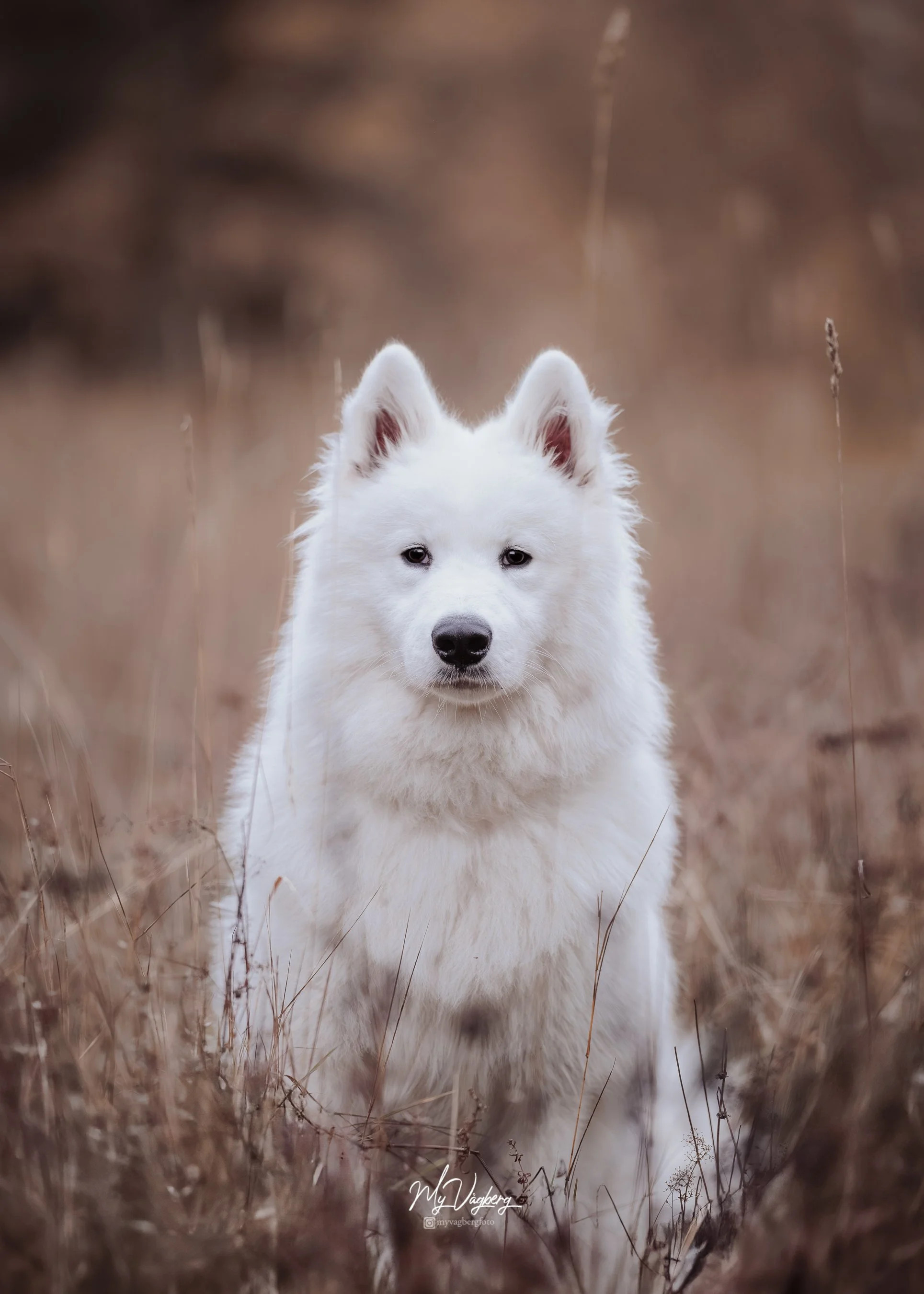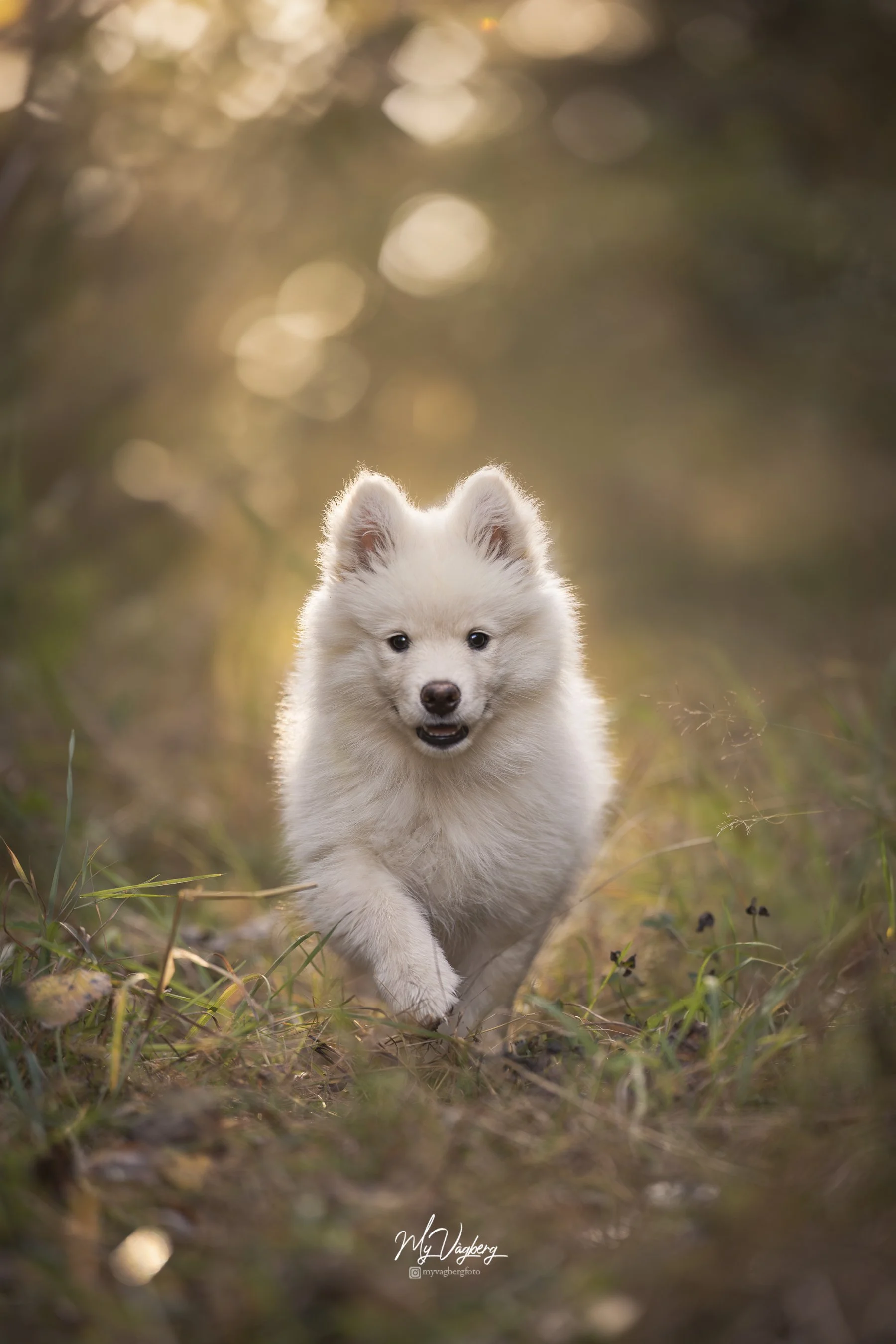 En fluffig vit valp sitter utomhus på gräs, med suddiga träd och solljus i bakgrunden.