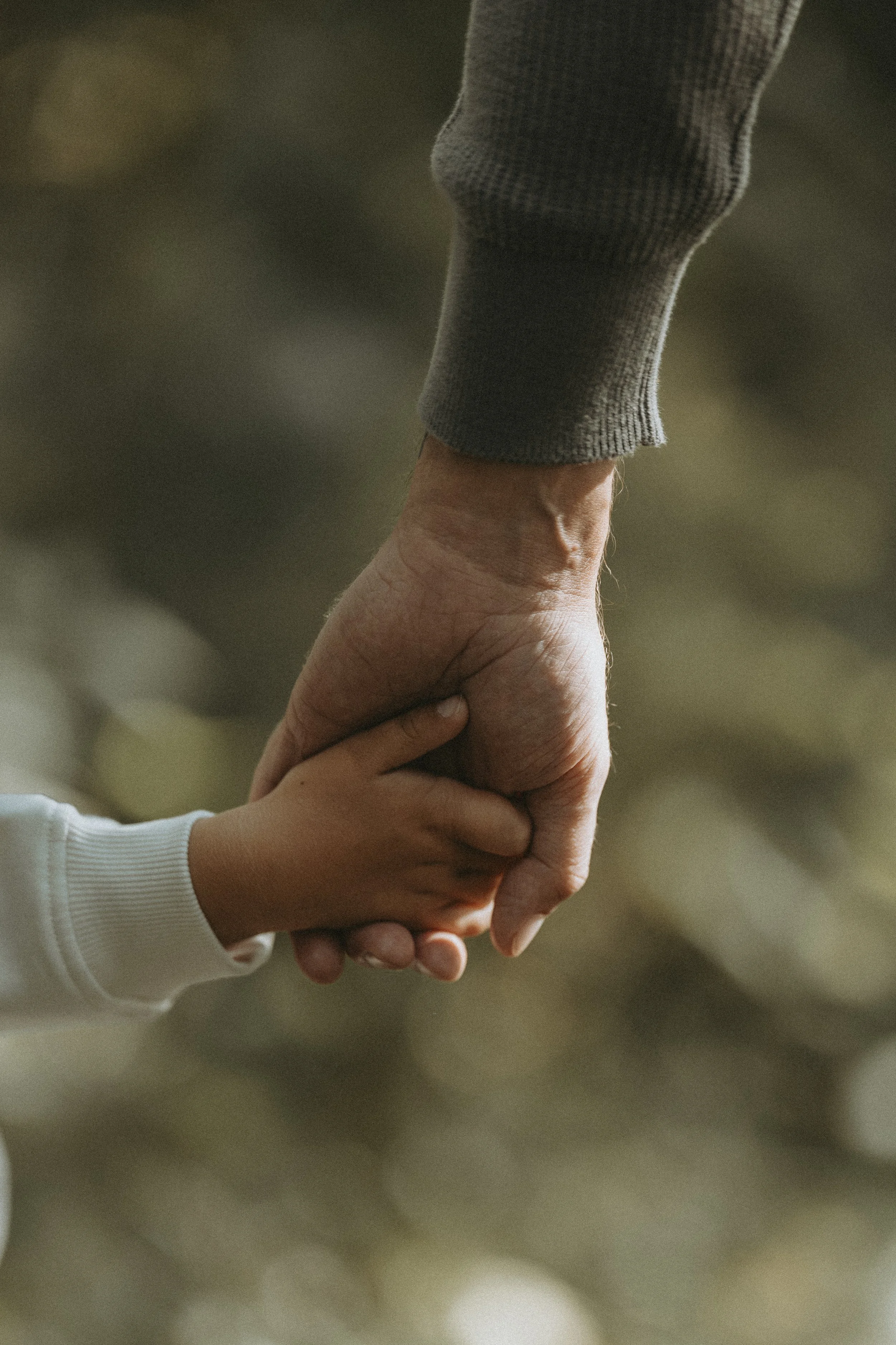 En närbild på en vuxen hand som håller ett barns hand. Den vuxna bär en grågrön ärm och barnet en vit ärm. Bakgrunden är ur fokus.