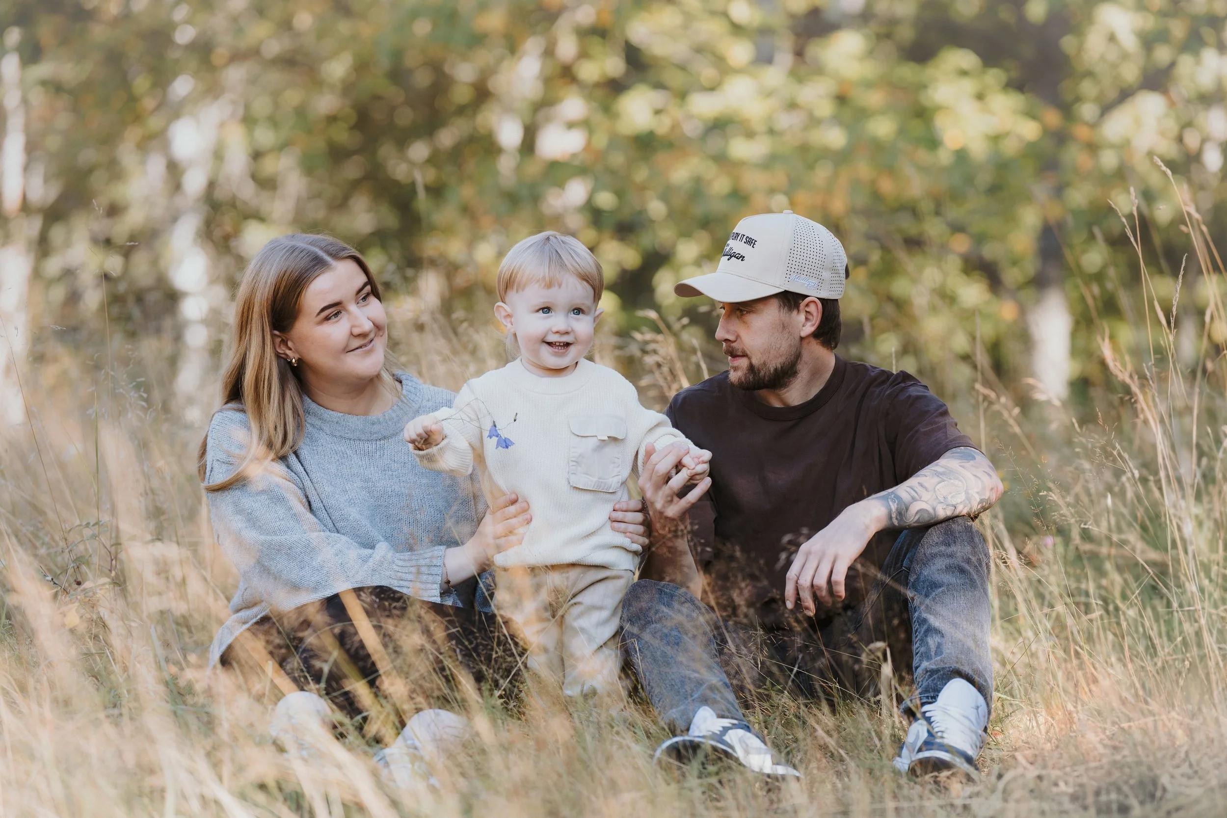En familj med tre sitter på marken utomhus i ett skogigt område på dagtid. Mamman har långt, brunt hår, pappan har skägg och en keps, och deras unga son med ljust hår sitter i mammans knä.