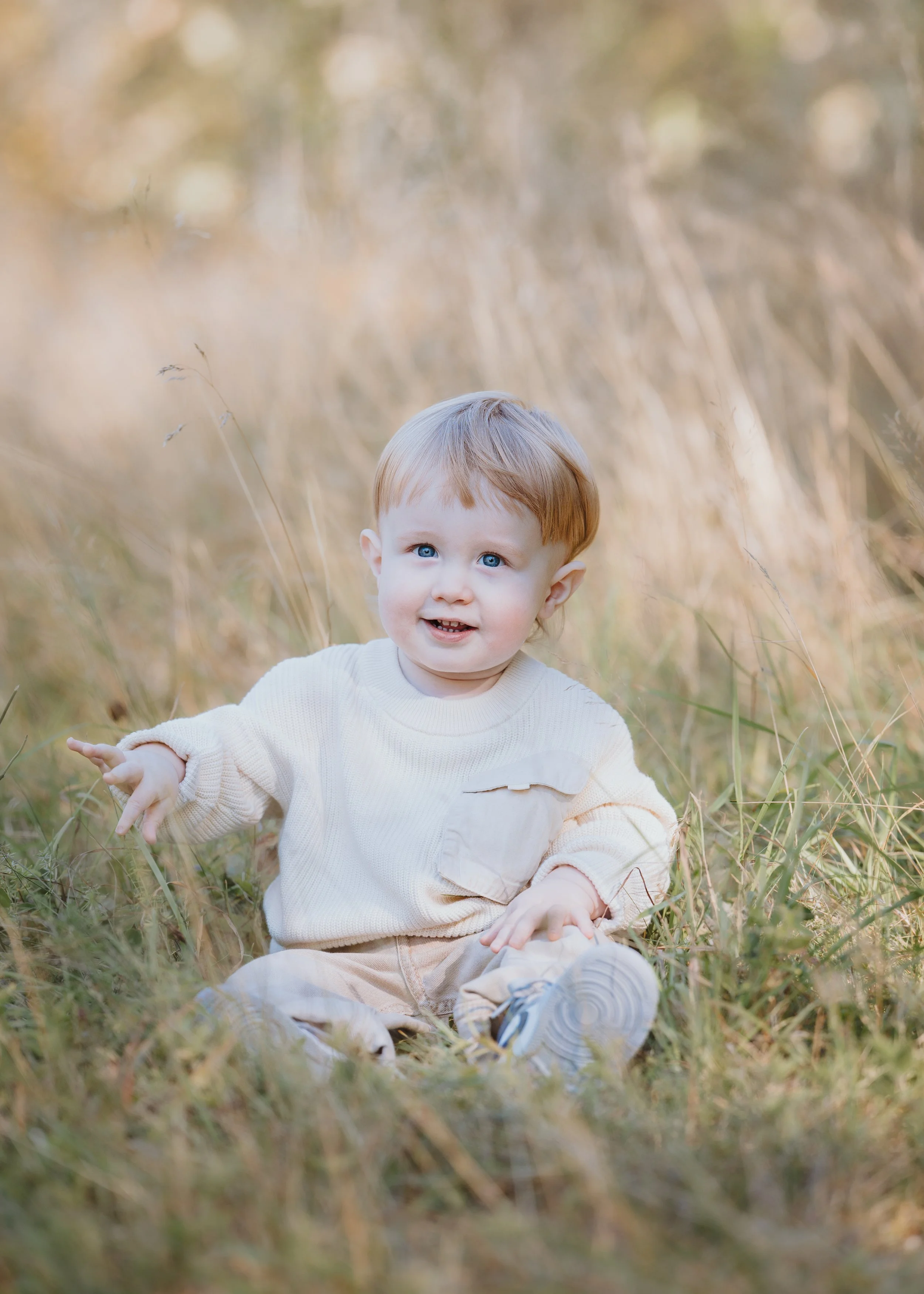 Ett ungt barn med blå ögon och kort rött hår sitter i ett fält med högt gräs och en mjuk suddig bakgrund av natur.