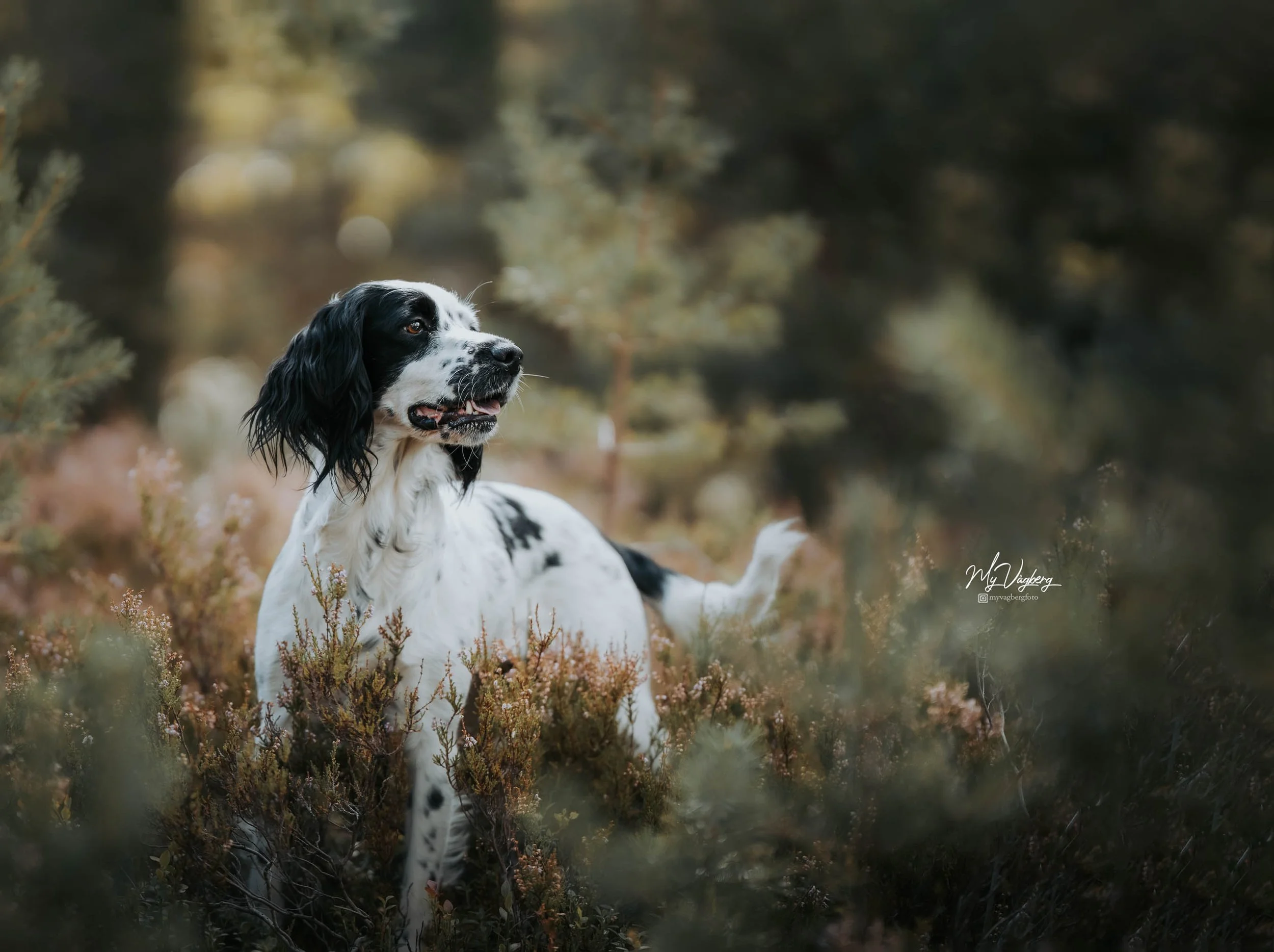 En engelsk springer spaniel med svart och vit päls bland buskar i en skog.