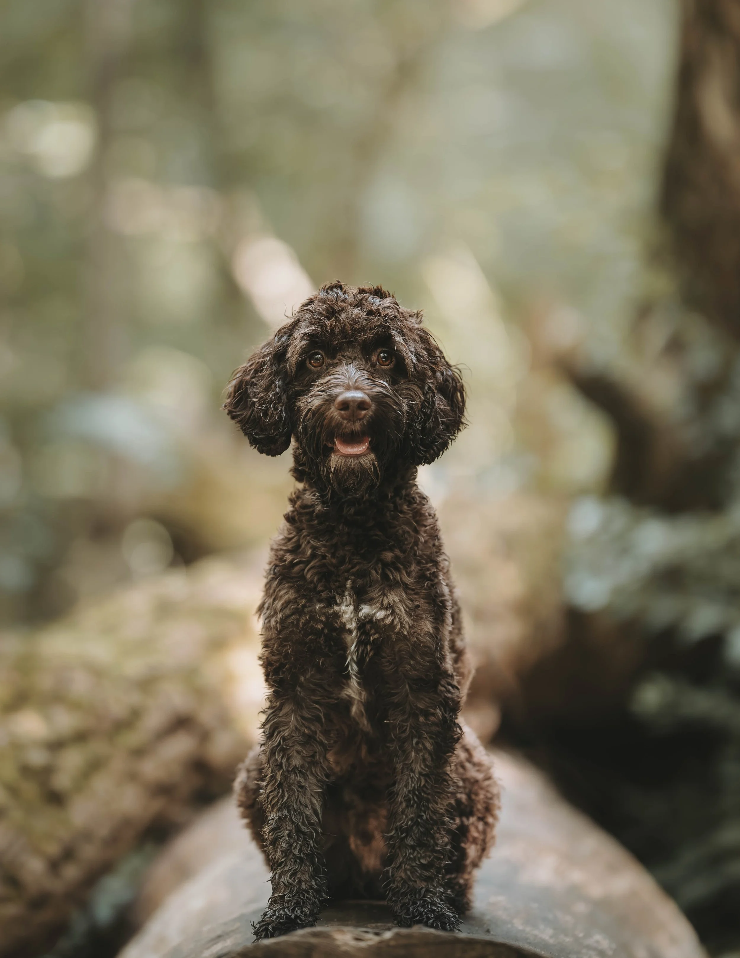 En glad, brun lockig hund sitter på en trädstam utomhus i en skog.