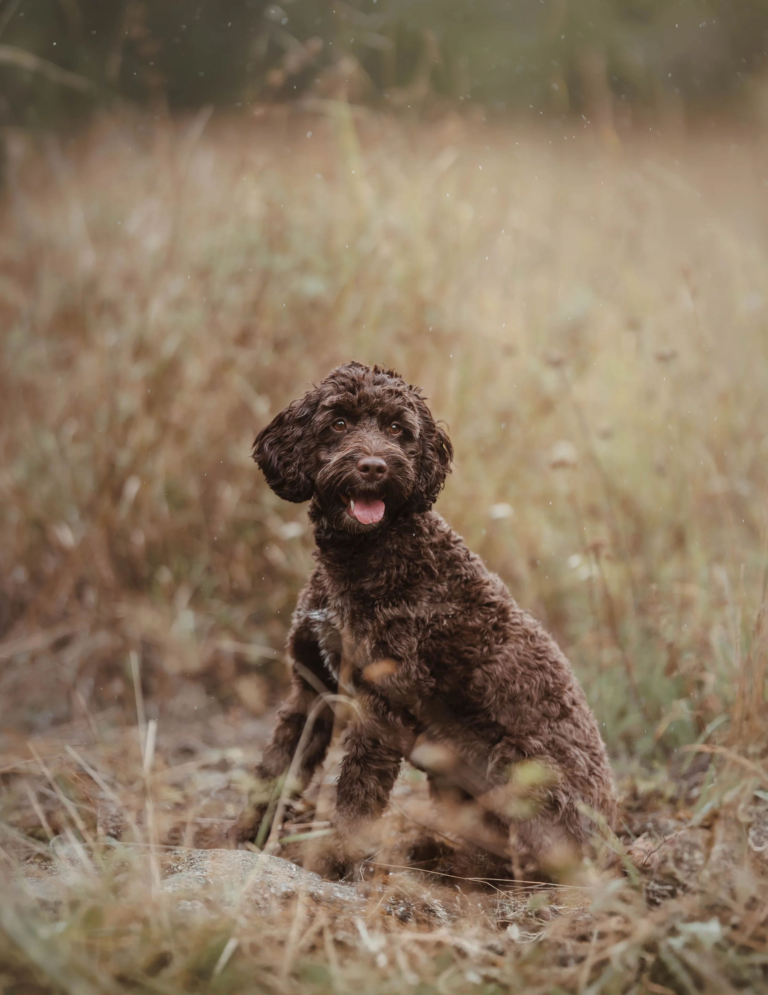 En söt, lockig brun valp sitter utomhus i ett gräsfält med en suddig bakgrund.